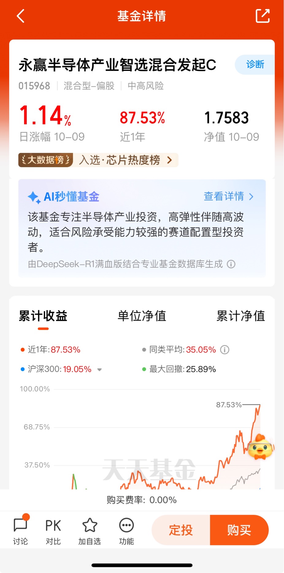 $永赢半导体产业智选混合发起C$ 昨天收1.14%,近一个月收25.32%,近3个月收51.19%,近一年收87.53%,表现优秀!聚焦光刻机产业链,弹性十足。openAI与AMD达成百亿美元芯片合作,又加上存储芯片需求端旺盛,持续涨价,板块基本面向好的同时又迎利好催化。