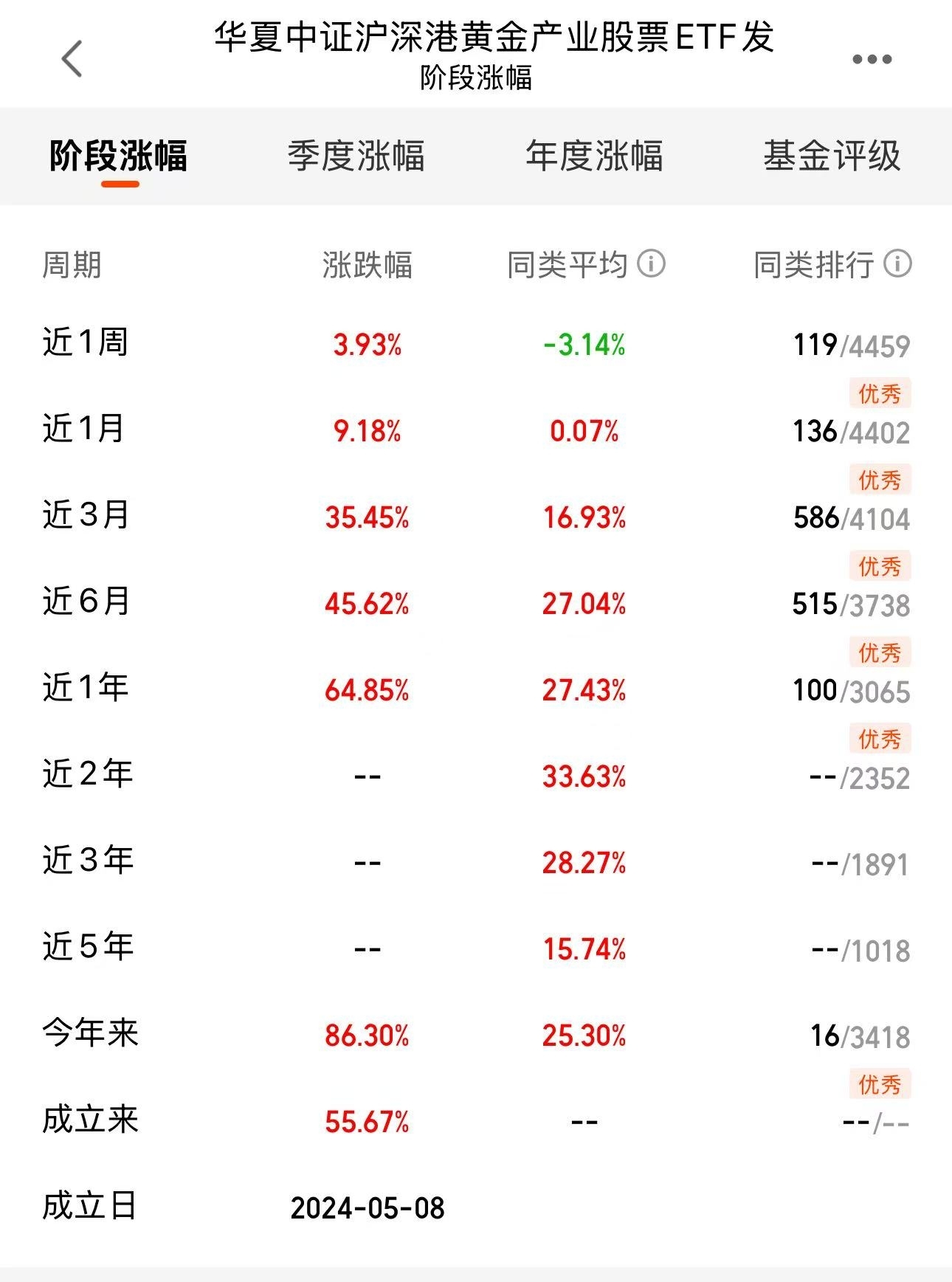 近一个月收益9.18%,近3个月收益35.45%,估值可以上涨空间大,在美元走弱大趋势及地缘不确定性等背景下,黄金的需求日益增强,果断加仓$华夏中证沪深黄金产业股票ETF发起式联接C$