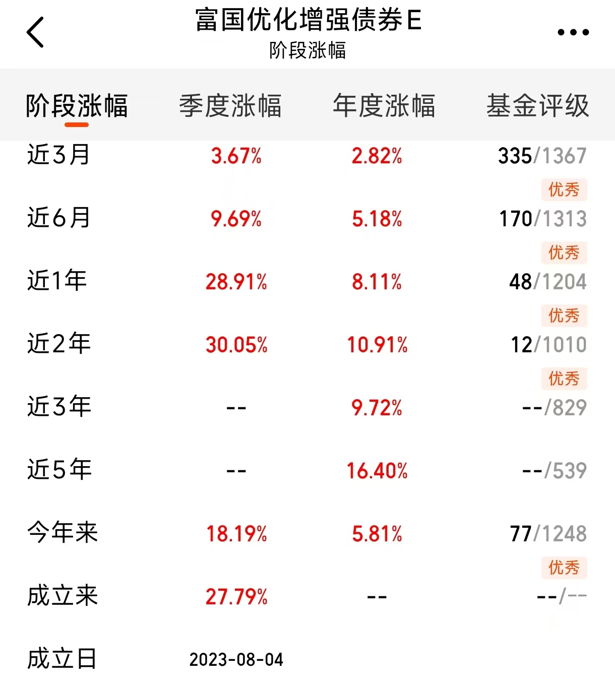 感觉到年底之前可能都会是震荡,就算是牛也很难一蹴而就,太快的行情估计也都不想看到的。现在我倒是觉得可以看看这种,$富国优化增强债券E$(018980)这种其实就很适合现在这种时候,一年赚差不多30%,最大回撤不到8%(沪深300都15%),这基金2股4可转债4债的配置,比股基更均衡,收益比起来却也不差。之后行情启动了,这种不会错过,在这种震荡期体验又更好。#OpenAI联手博通!AI产业链怎么投?#
