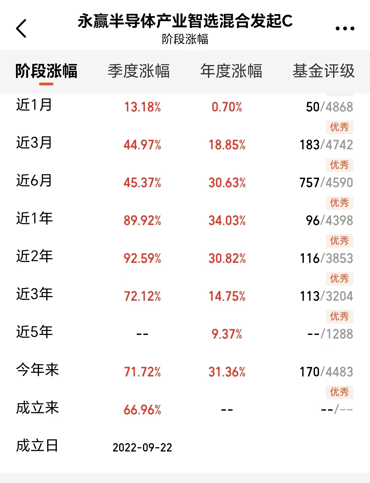 作为永赢智选系列主动型绩优基金,该产品专攻半导体领域,精准布局光刻机这一产业核心环节。最新数据显示,基金业绩表现亮眼,近1月上涨13.18%,近三月上涨44.97%,近6月上涨45.37%,近1年涨幅高达89.92%,显著优于多数同类产品。