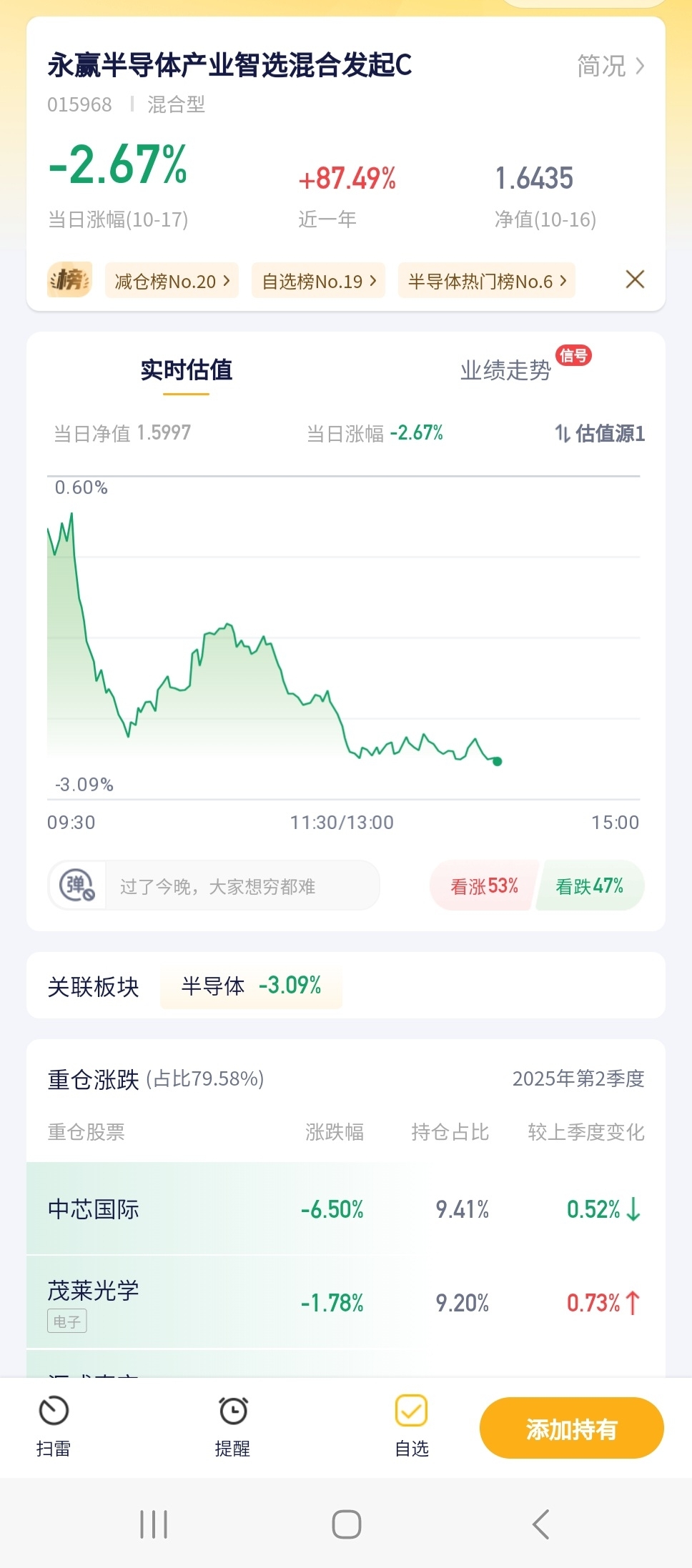 今天这基金跌了些,半导体板块今天表现疲软,行业没什么利好刺激,就跟着下跌了。