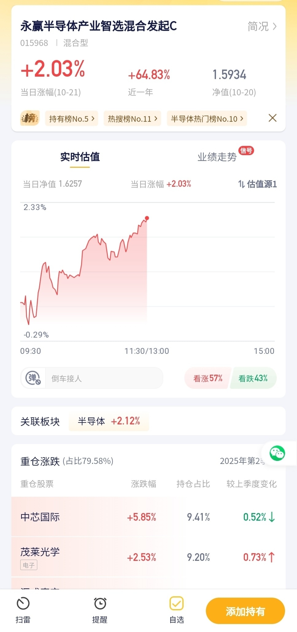 永赢半导体产业智选混合今日预估涨幅2.03%!