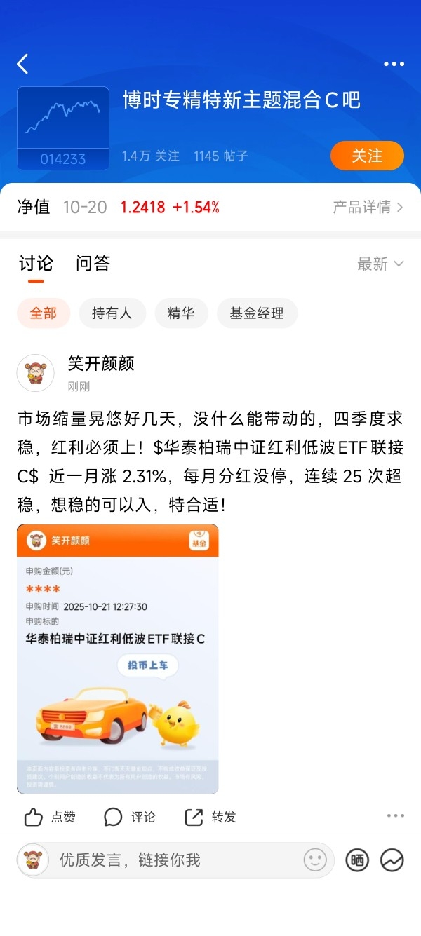 最近市场成交蔫儿了,没什么主线扛得住,四季度想稳点就切红利!$华泰柏瑞中证红利低波ETF联接C$ 近一月大涨 2.31%,每月都分红,连续 25 次了,防御拉满还能赚分红,靠谱!