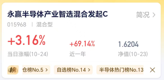 近期,光刻机相关话题热度居高不下,而聚焦这一热门赛道的$永赢半导体产业智选混合发起C$ (015968),凭借对光刻机产业链的深度剖析与卓越的精准选股策略,持续为投资者创造可观收益,今日涨幅已超3%。