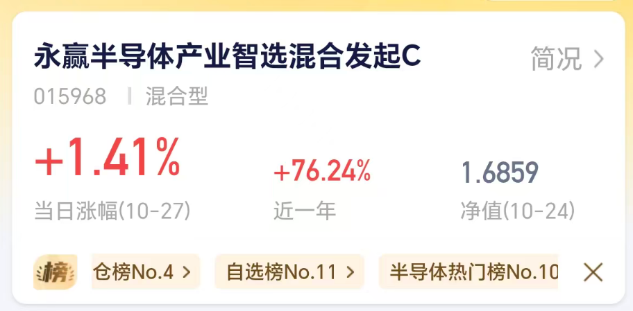 近期,在利好因素推动以及AI领域需求增长的双重刺激下,半导体板块整体表现十分亮眼,呈现出强劲的上升态势。其中,专注于光刻机赛道的$永赢半导体产业智选混合发起C$ (015968),凭借对光刻机产业链的深度剖析与精准选股策略,不断为投资者创造可观收益。今日,该基金再度上涨超1%,短短两天累计涨幅便已超过5%。