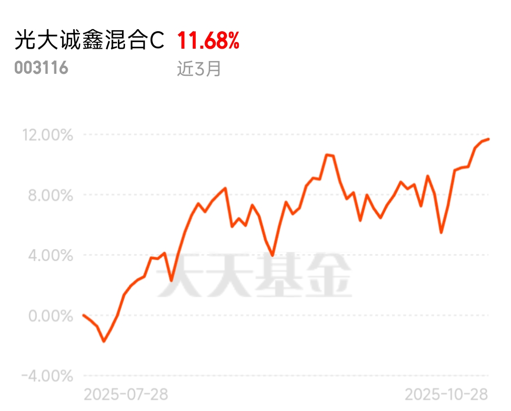 这段市场走势不算平稳,能稳住收益的基金才靠谱。光大诚鑫混合C就做到了,近3个月涨了11.68%,在当下行情里算很亮眼的了。