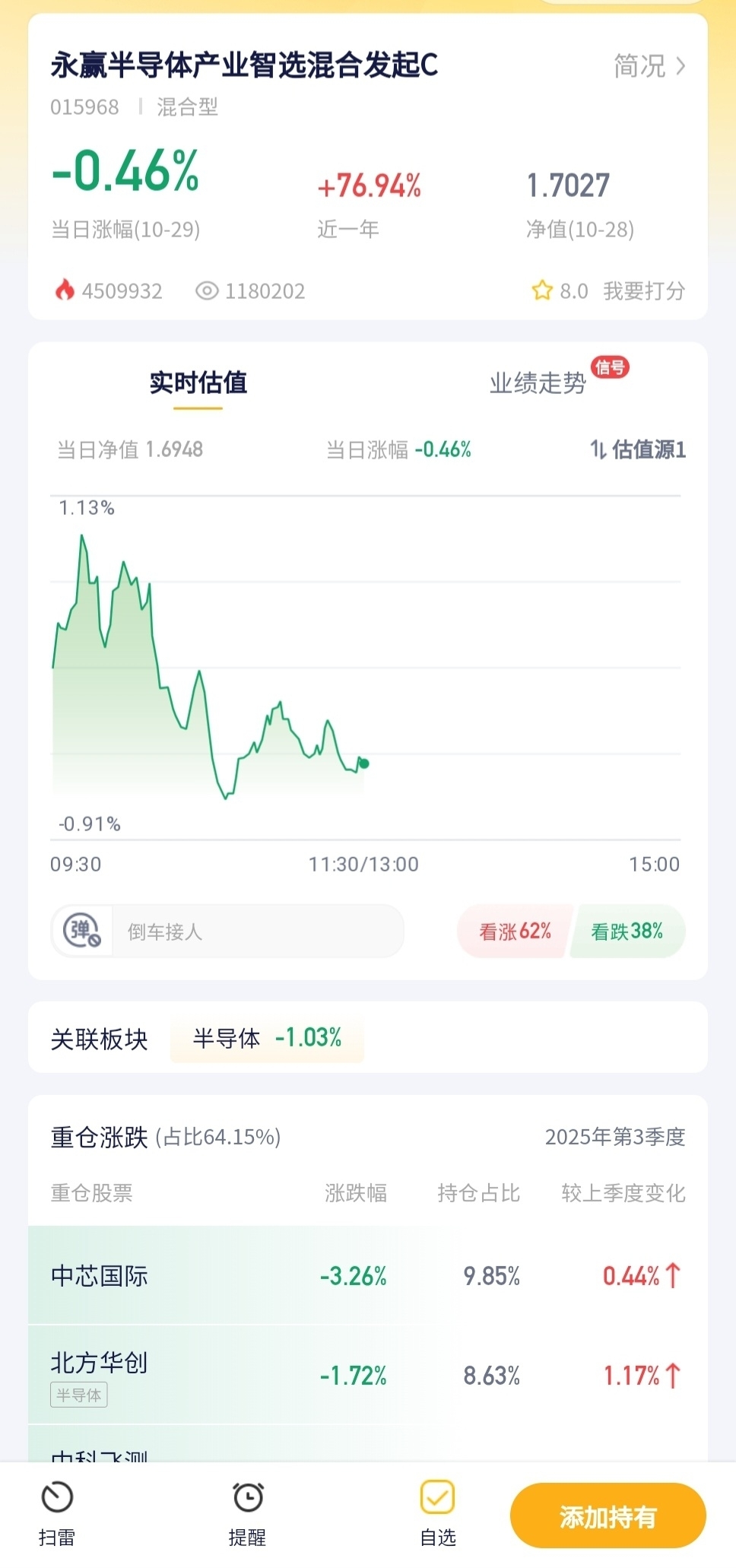 今天跌了0.46%。半导体板块今天有点拉胯,虽然长期逻辑在,但短期市场情绪影响,导致这基金也跟着跌了,不过别慌,长期看看再说。