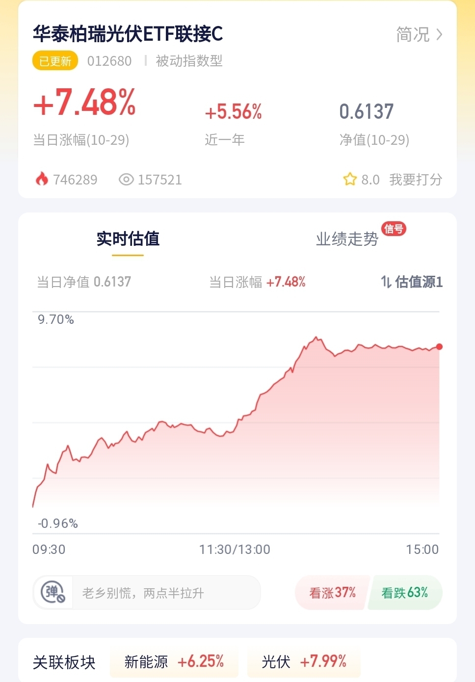 今儿光伏的行情太顶了,ETF单日飙涨8个点,隆基绿能这种龙头都封板了。核心原因就是行业要“反内卷”了,不搞恶性竞争了,17家大企业都抱团了,政策也支持整治,以后赚钱能力肯定上去。我打算布局点华泰柏瑞,借道基金参与,比自己瞎买个股稳多了。