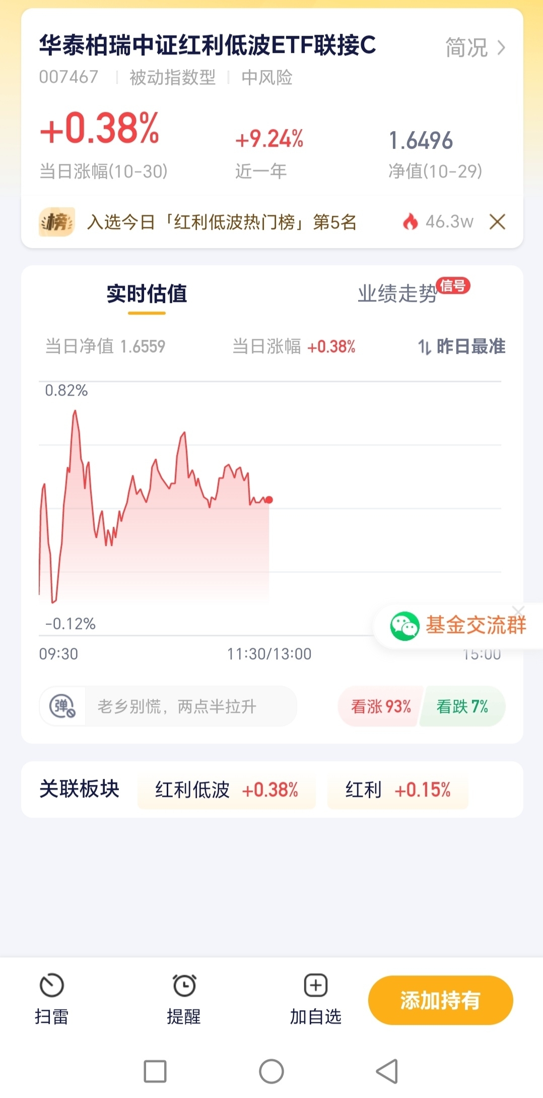 今天红利低波板块涨了0.38%,稳中有赚的感觉太踏实了!要是你也喜欢这种“不激进、靠得住”的投资风格,华泰柏瑞得瞅瞅。它今天涨了0.38%,近一年涨了9.24%,是被动型的,跟着红利低波指数吃红利。咱们普通投资者选它,就不用纠结“哪个股票分红多、波动小”了,买它就等于把这些“好事”全打包了,想在市场里求稳的,赶紧关注这只基,抓住稳稳的收益!$华泰柏瑞中证红利低波ETF联接C$ #A股突破4000点!下个目标位在哪?#