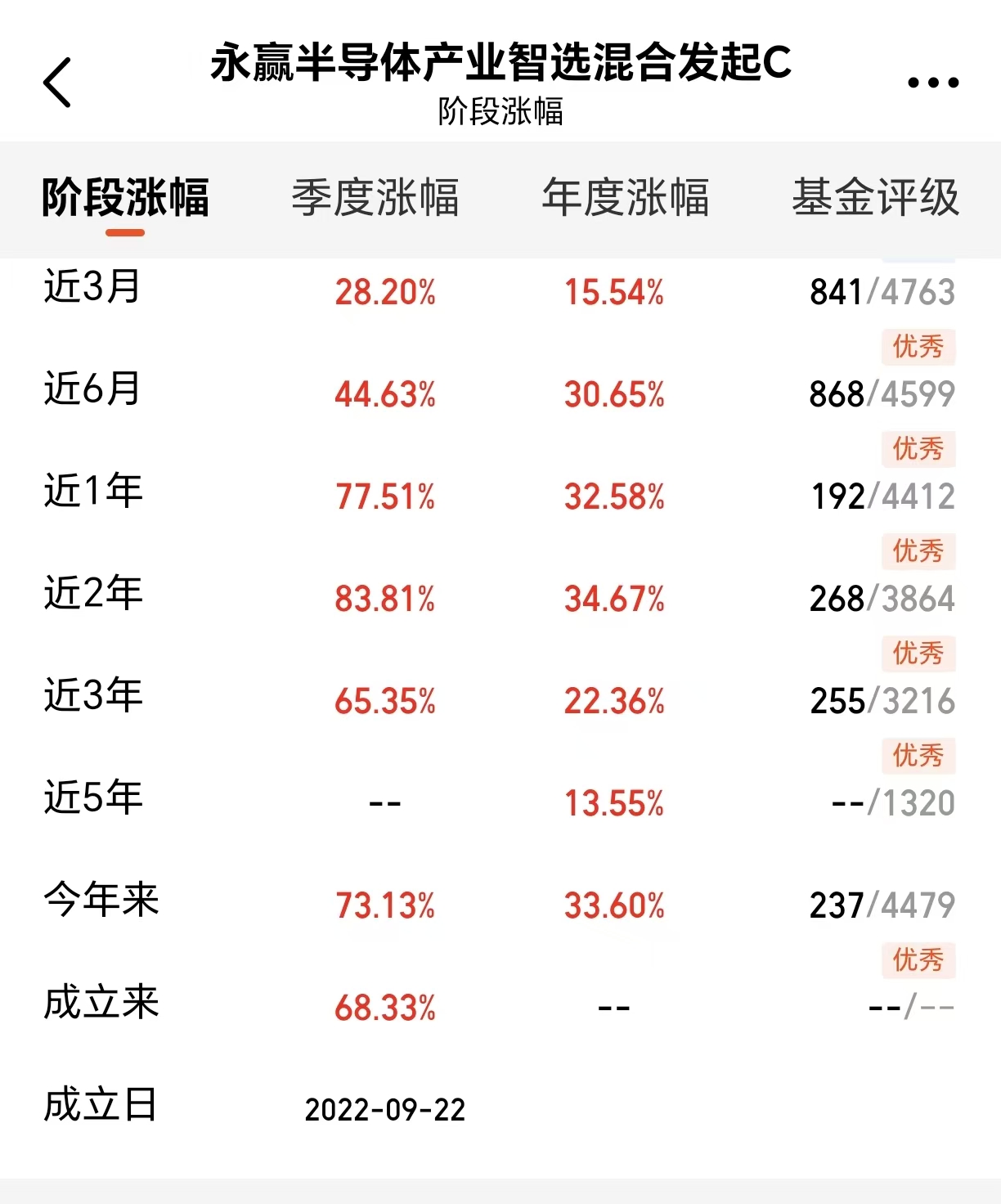 光刻机国产化进程加速,市场需求持续增长。$永赢半导体产业智选混合发起C$ (015968)深度挖掘光刻机赛道,精选个股持续斩获收益,成为投资者布局产业的优选工具。该基金近1年上涨77.51%,今年来收益73.13%,远超同类平均水平,展现强劲赚钱效应。
