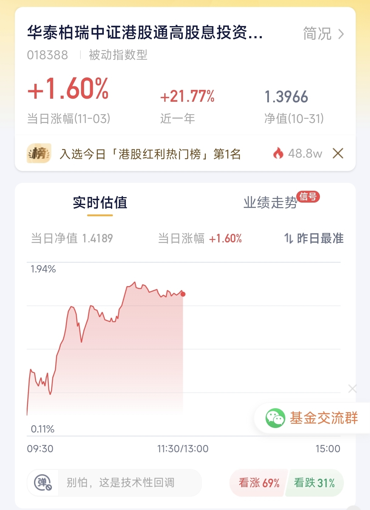 最近身边人都在聊红利,今天一看行情果然没让人失望,港股通红利稳步上涨,抗跌又能赚收益。它的成分股都是盈利稳、现金流足的优质公司,分红稳定,就算市场调整,分红也能对冲一部分亏损。现在市场不确定性这么多,大家都想找个避风港,华泰柏瑞就是绝佳选择。它不用你懂复杂的投资逻辑,跟着港股通红利指数走,把各行各业的高股息龙头都打包了,作为组合的压舱石,既能享受行情上涨的红利,又能靠分红增厚收益,普通人投资不就图个省心靠谱吗?#11月基金投资策略#