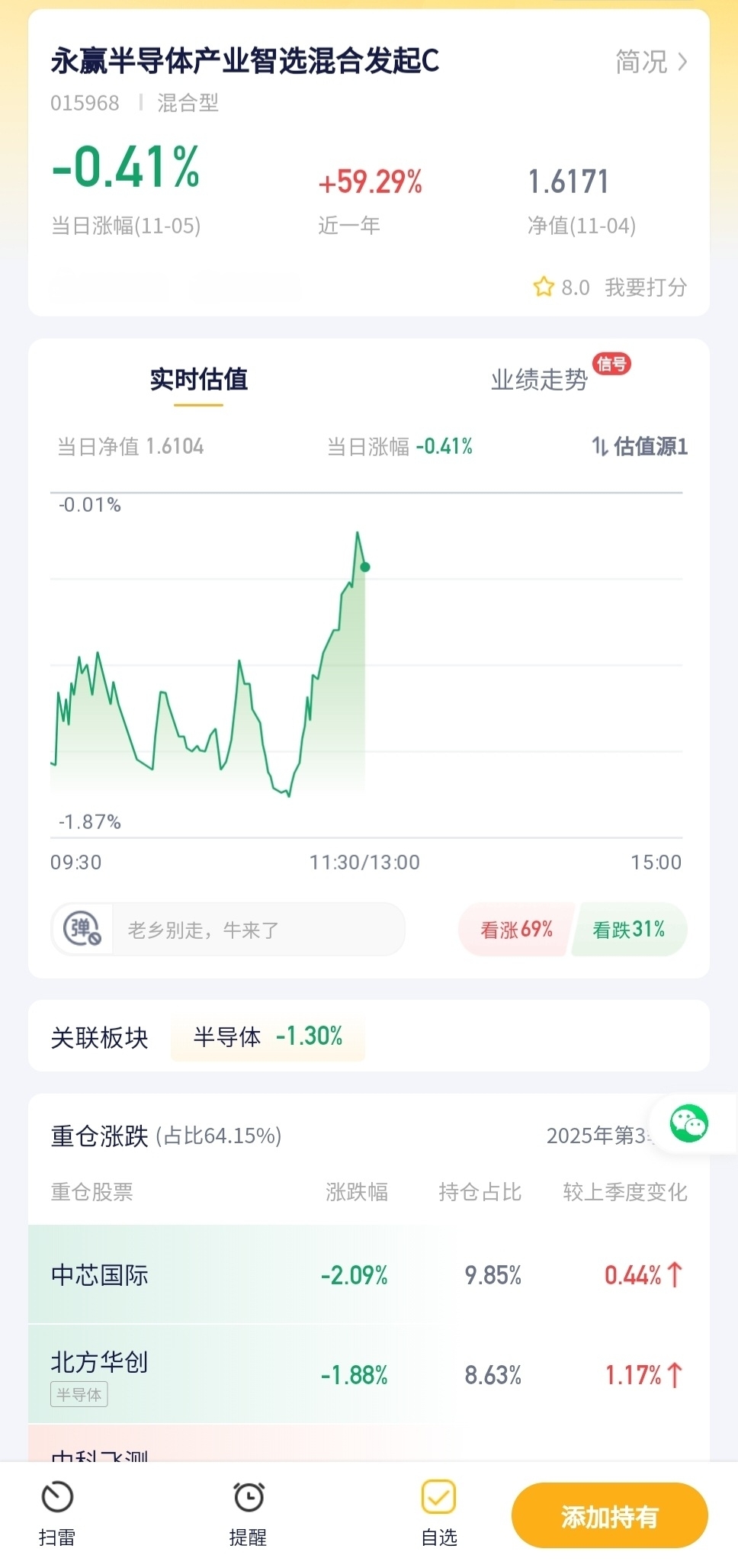 永赢半导体今天跌了0.41%,半导体板块今天走得不太好,拖累这基跟着跌了些,持有这基的朋友今天得承受点小波动。