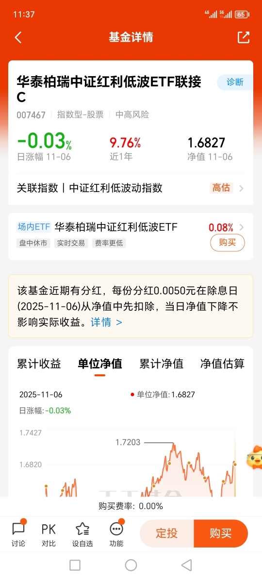 四季度一开局,我就把“不亏本金、保住收益”当成目标了!这阵子行情震荡得厉害,手里的高波动基金真不敢拿太多,转头看红利低波板块就很安心——波动小、有分红,典型的“稳字派”。然后就想到华泰柏瑞,它刚好跟着这个板块走,不用自己研究个股,买进去就能跟着板块稳着来。今天它那点下跌是分红扣了净值,实际根本不影响收益,这种能“抗波动还能拿分红”的基,这不就是四季度守收益的好帮手嘛!$华泰柏瑞中证红利低波ETF联接C$ #慢慢投基路 你悟出了哪些投资哲学?#