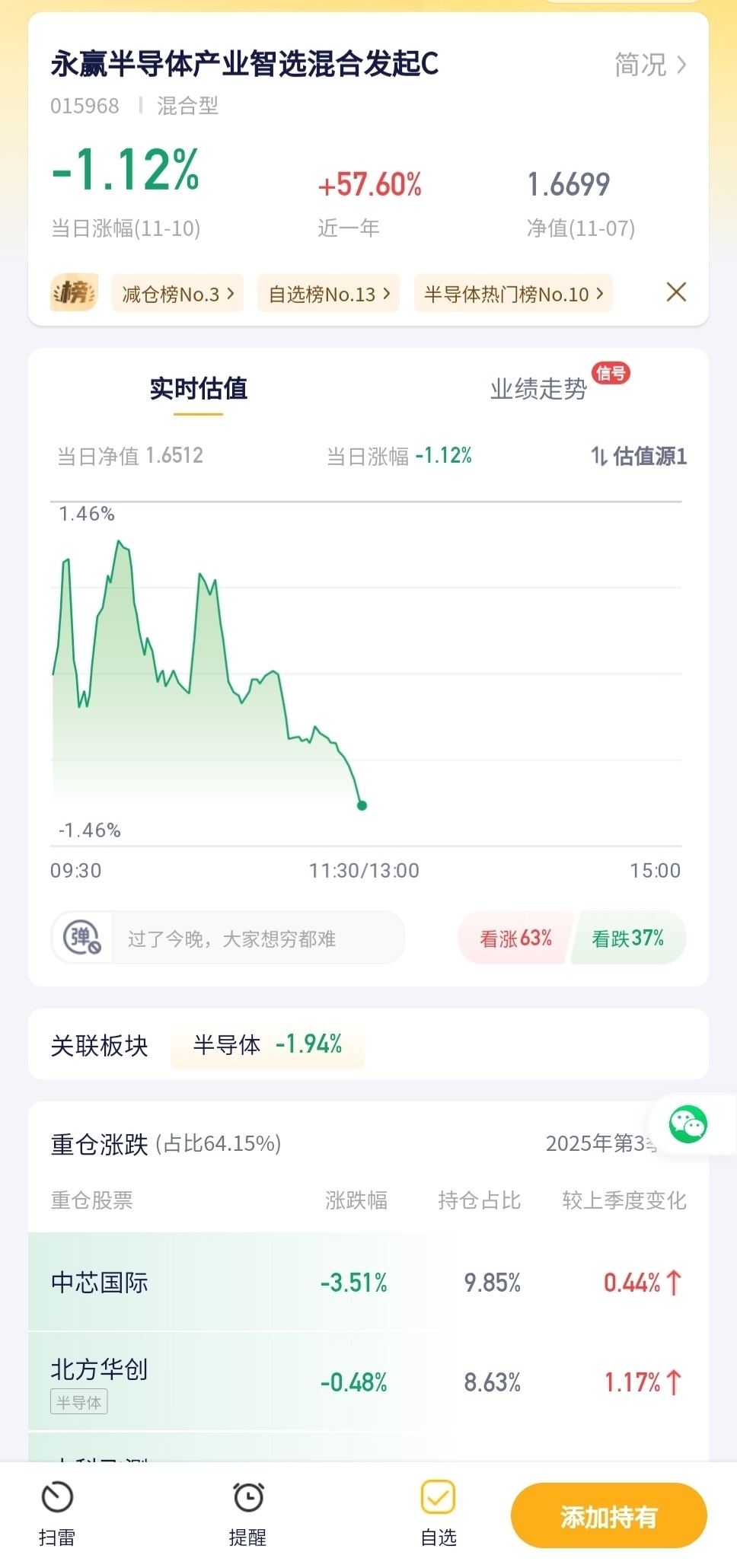 半导体板块今天表现拉胯,这只基金跌了1个多点。半导体行业受市场情绪和技术迭代影响大,波动难免,想布局的朋友可以考虑逢低慢慢加。