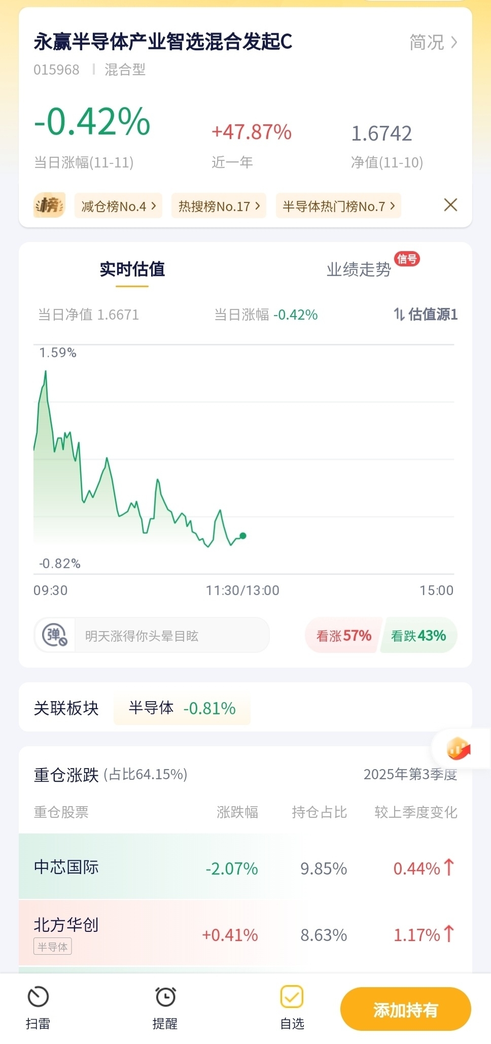 半导体板块今天表现不佳,这基金跌了0.42%,半导体行业起伏大,得有耐心等着。