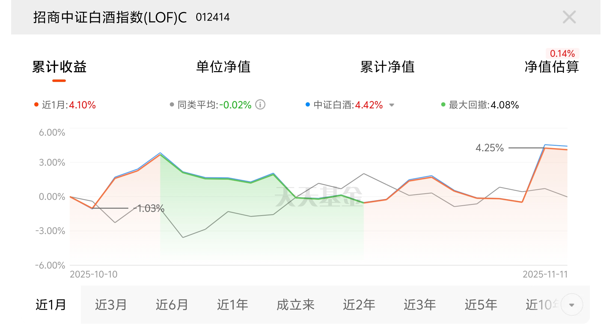 科技板块回调明显,资金正在寻找新的增长点,消费板块凭借复苏态势脱颖而出。今天白酒指数走势亮眼,消费转好的节奏不停,招商中证白酒指数C近1个月涨4.10%,跟着刚需赛道走,投资更有方向。