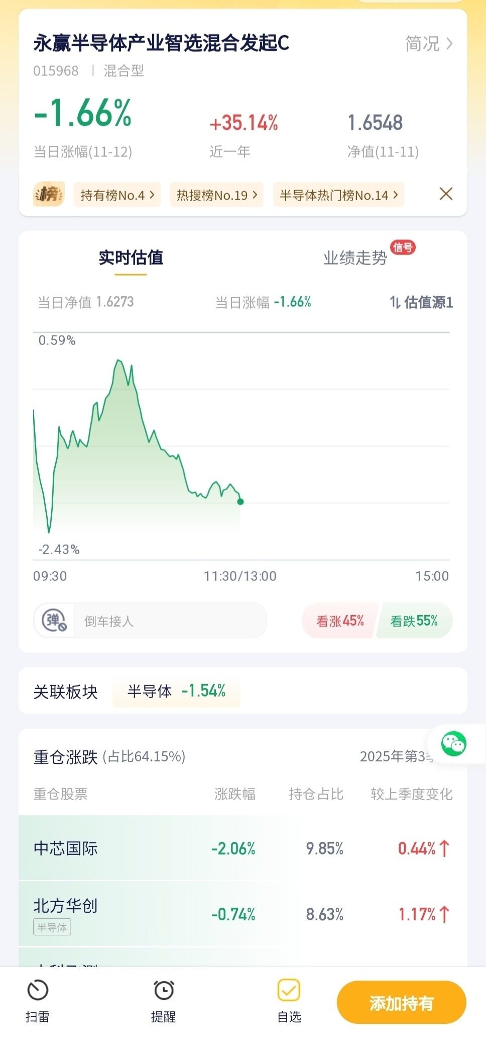 半导体今天表现疲软,永赢这只基金跟着下跌,行业面临一些压力,企业业绩预期不太乐观,资金也不敢轻易进场,它就跟着跌了。