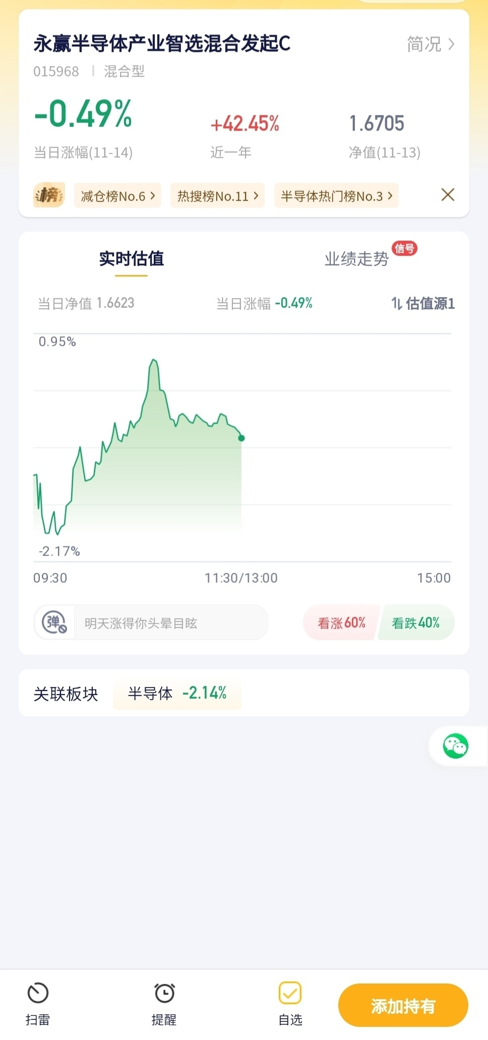 半导体板块今天不太给力,跌了近半个点,这基金也跟着下跌,半导体爱好者可以关注后续板块反弹机会。