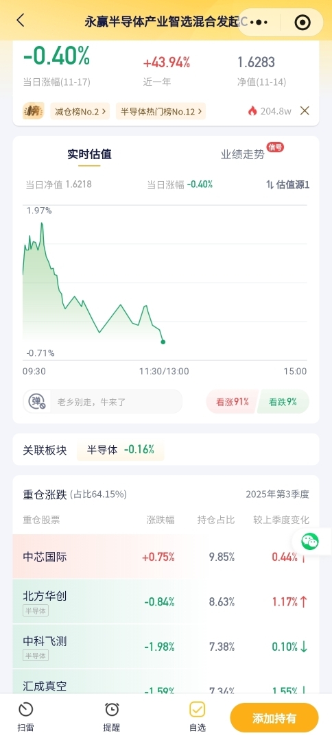 永赢半导体产业智选混合发今日预估跌幅-0.40%!