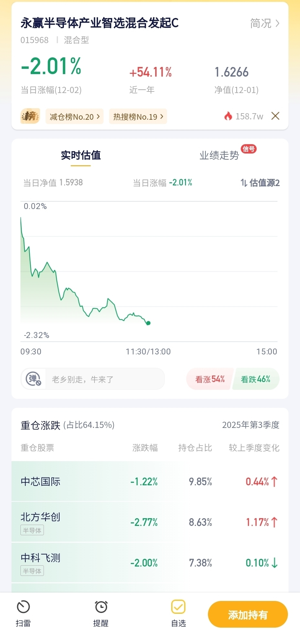 半导体今天跌了2个点,这基也跟着往下走。科技里的半导体板块今天调整幅度不小,属于今天跌幅靠前的板块之一,波动确实有点大。