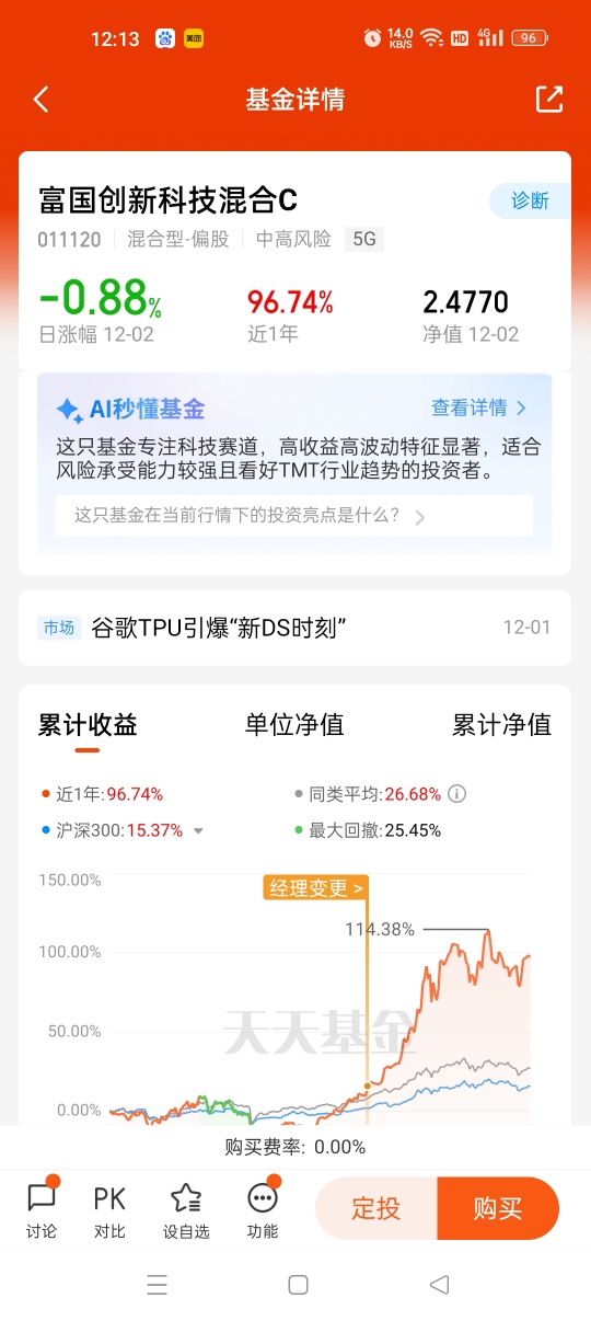 这只富国基金不错$富国创新科技混合C$ 今天估值是红的,0.33%,今年来表现很不错,可以关注