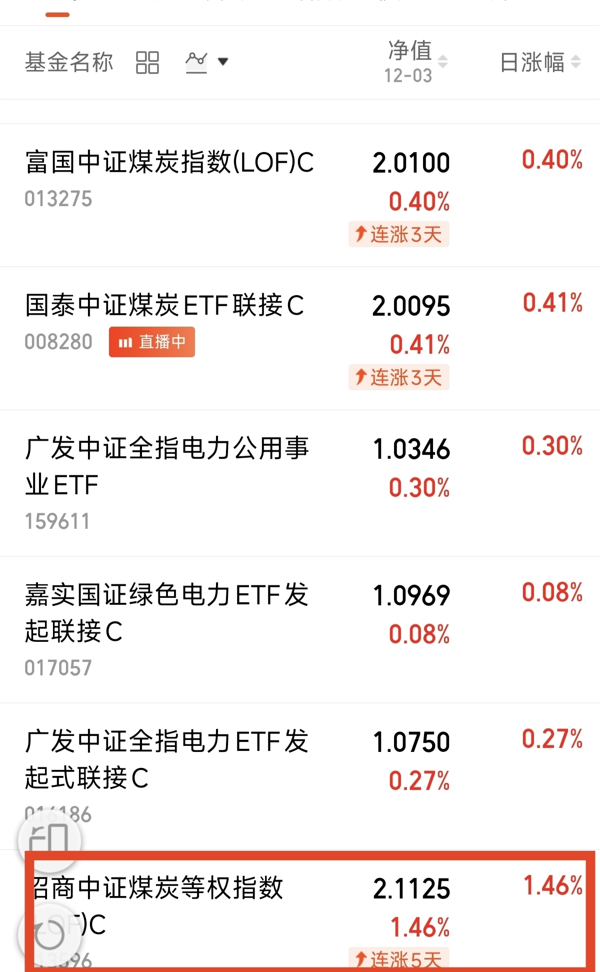 $招商中证煤炭等权指数(LOF)C$ 这只聚焦煤炭产业的指数基金。紧跟中正煤炭等权指数。昨天上涨了1.46%。连续5天连涨,期待继续突破。