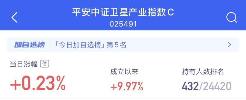 今天A股市场高开震荡,三大指数涨跌不一,卫星产业倒是逆势上涨给力得很,$平安中证卫星产业指数C$ 目前上涨了0.23% ,成立以来涨幅9.97%,该基金紧密跟踪卫星产业指数,覆盖卫星制造,发射,通信等全产业链,继续看好它期待后续的表现!