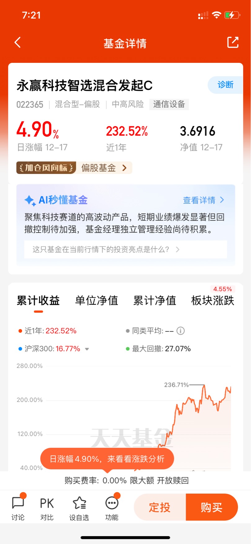 $永赢科技智选混合发起C$ 今天大涨了4.90%,不愧是大科技啊,弹性就是强,近半年涨超144%,近一年涨超232%,业绩爆发力十足,在同类中排名榜首,聚焦科技赛道,主投CPO产业链,期待更好的表现了!
