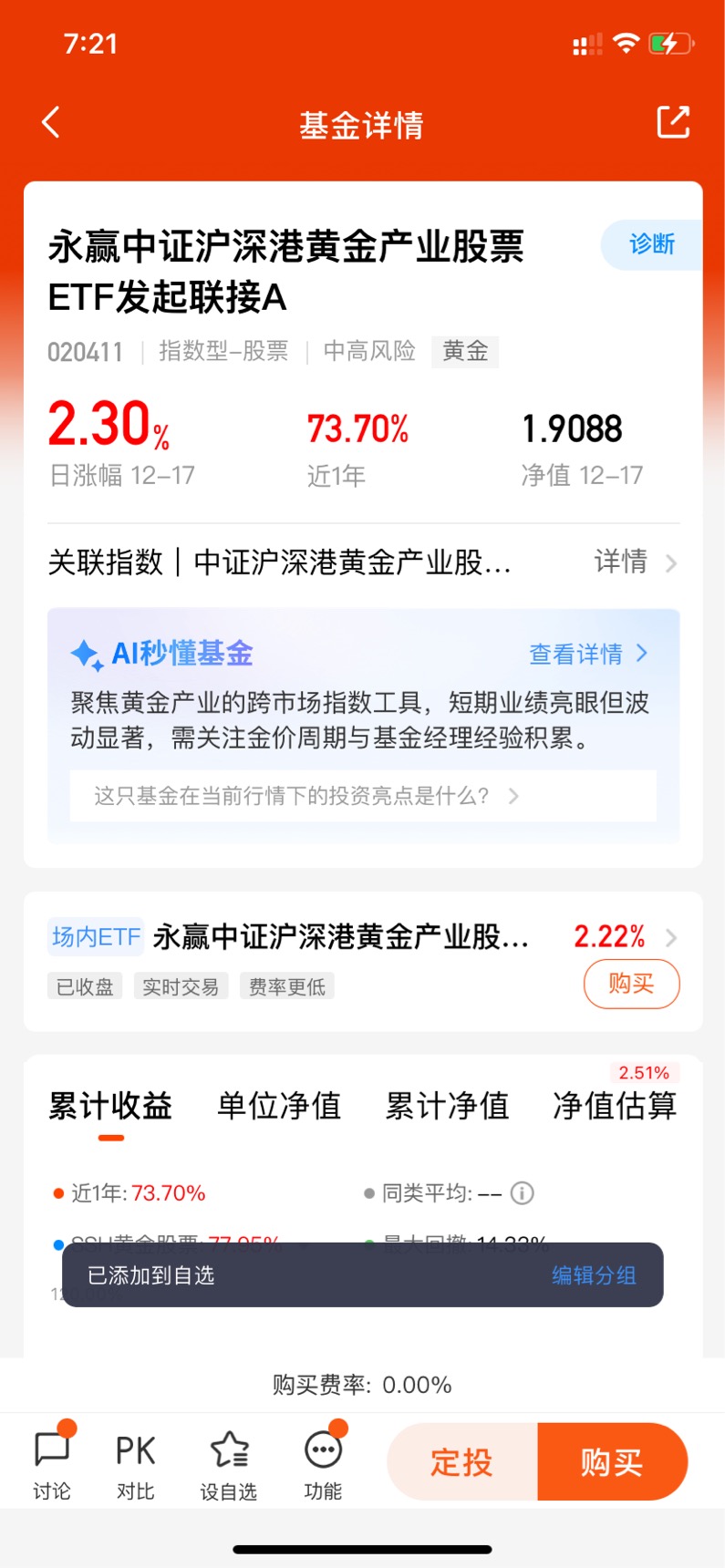 $永赢中证沪深港黄金产业股票ETF发起联接C$ 今天涨了2.30%,四天三涨,近一年涨超73%,各个阶段业绩表现都很优秀,岁末年初,黄金的走势越来越给力了,期待接下来的表现!