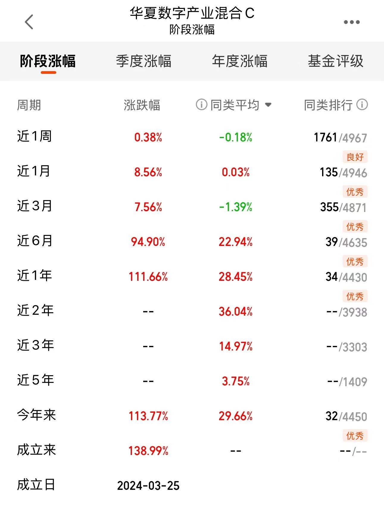 数字经济是市场成长性比较好的赛道,这基一年收益111%+,在全市场18000多只基金中排35,$华夏数字产业C$所有阶段表现在同类产品中也都很优秀,可以趁低位加了