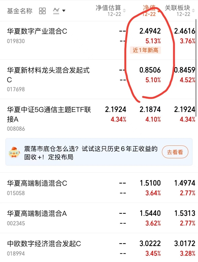美滋滋!上周调整的时候正好抄底$华夏新材料龙头混合发起式C$,今天直接开门红,反弹超5个点,加上前段时间买的$华夏数字产业混合C$,这俩是我手里基涨幅最高的,还好果断持仓踩中了新材料核心需求,现在产业风口正盛,后续收益还能冲,正好华夏也是个老牌有实力的公司,它家基金我都关注不少,兄弟们可以跟紧我