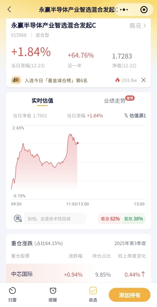 今天这只半导体基金涨得挺给力的,主要是半导体板块今天迎来了资金追捧,市场对半导体产业链的景气度预期有所提升,相关龙头股表现强势,带动这只基金跟着往上走。而且近期半导体行业的政策利好也在逐步释放,资金对科技硬科技赛道的关注度持续提高,这只聚焦半导体产业的基金自然也吃到了板块红利,预估涨幅能到1.84%也算符合板块整体的表现了。