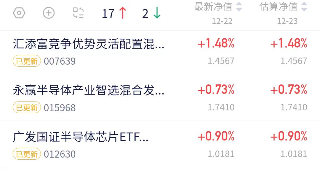 友友们,今天股市行情继续反弹,沪指5连涨,年底行情值得期待,芯片赛道弹性大,昨天涨幅可观,今天继续反弹上涨。汇添富竞争优势灵活配置混合昨天就涨超6个点,今天又涨1.48%