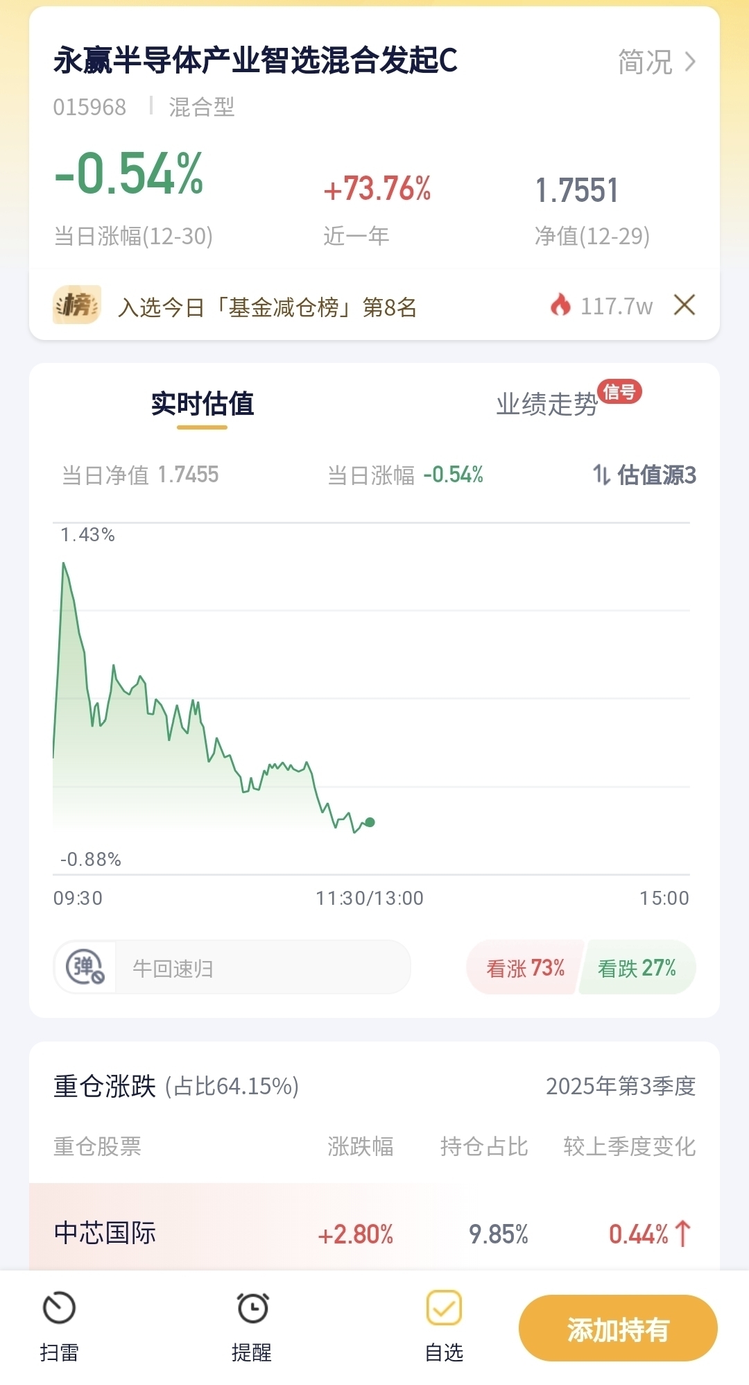 永赢半导体产业智选混合今天跌了0.54%,半导体板块今天整体走弱,虽然半导体行业的国产替代逻辑没变,但短期板块内个股有获利回吐的压力,加上部分半导体企业的产能数据不及预期,资金出现了短暂的撤离,这只重仓半导体的基金也跟着回调,不过半导体作为科技核心赛道,后续仍有反弹的可能。