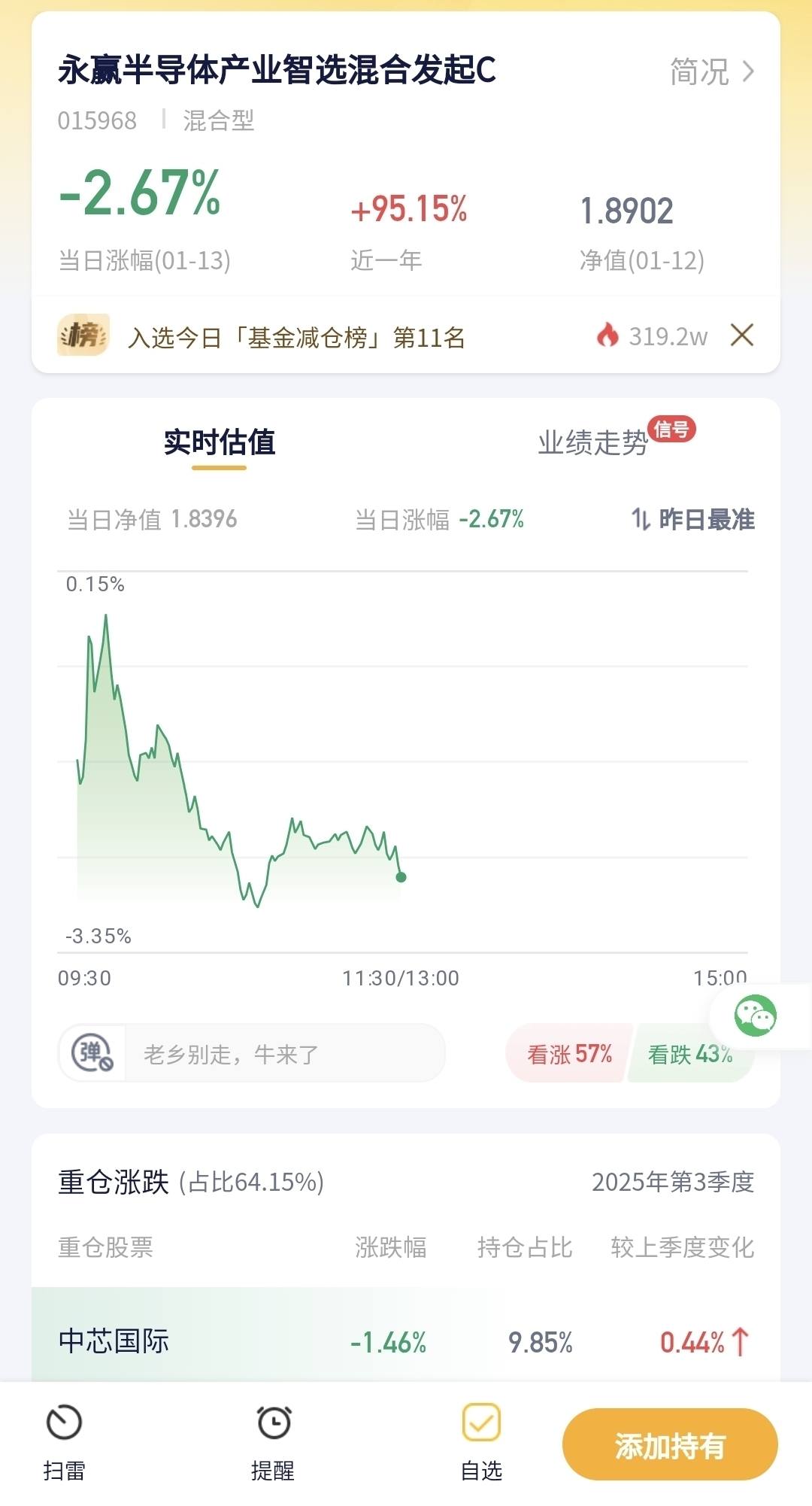 永赢半导体今天跌得比较多,半导体板块今天领跌市场,主要是行业内部分公司的业绩预告不如预期,加上半导体材料价格有波动,市场对板块的信心有点不足,资金出逃导致板块走弱。这只基金专注半导体产业,持仓很集中,所以跌幅比其他科技基金更大,短期半导体板块还得磨底,得耐心等基本面好转。