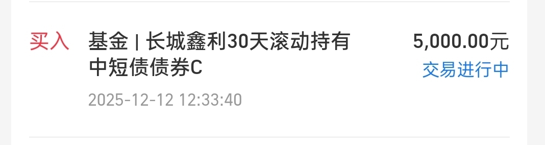 $长城鑫利30天滚动持有中短债C$ +5000,昨天稳稳收益1枚,12月美联储宣布降息25个基点,利好债市,资金面趋于宽松,市场情绪明显回暖,债市又涨的涨起来了,策略上补仓些短债放着,稳稳参与波行情。长期看,近一年收益2.48%,走势温和,收益也不错,有闲钱就往里面存,收益直接比定期和余额宝多几倍。最关键的是,不仅收益漂亮,连回撤也控制的相当不错,收益走势非常平稳,主要持仓112.42%信用债为底仓,搭配了8.05%利率债波段获取收益,全仓都是纯债,没有股票,波动低、安全性高,临近年末了,还是稳着点来,债市还没企稳就能恢复日收1蛋,因为是信用票息策略为主,收蛋能力强,适合年末保收益,继续补仓5000放着,当做底仓放着了!