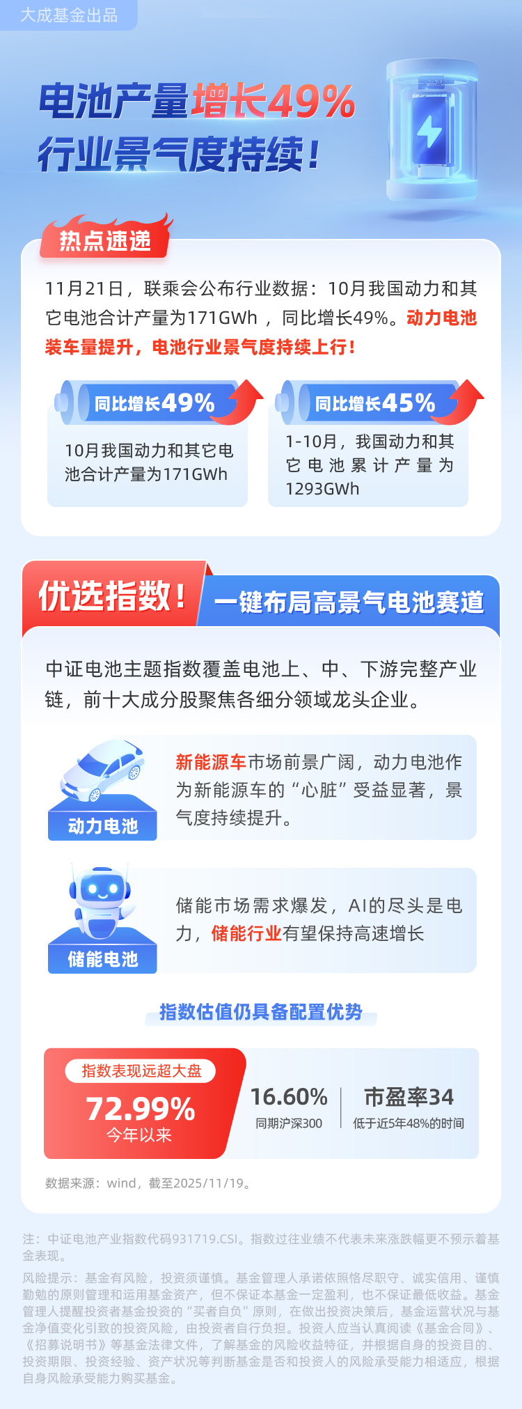 相关基金:$大成中证电池主题指数发起A(OTCFUND|015997)$ $大成中证电池主题指数发起C(OTCFUND|015998)$ $大成新能源混合发起式A(OTCFUND|014141)$ $大成新能源混合发起式C(OTCFUND|014142)$