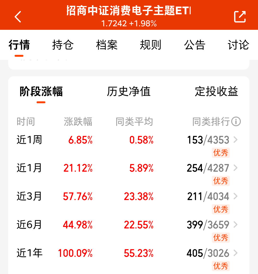 最近股市震荡,板块轮动还是有点快,我发现近期资金有抄入消费电子板块的迹象,因为它覆盖的寒武纪、立讯精密、工业富联等前十大权重股,完美串联起芯片、组装、终端品牌全链条,能够最大化布局AI算力投资向终端应用的价值传导。我关注到了$招商中证消费电子主题ETF联接C(OTCFUND|016008)$,昨天上涨1.98%,近一年涨幅100.09%,已经翻倍啦。大家也可以关注一下。