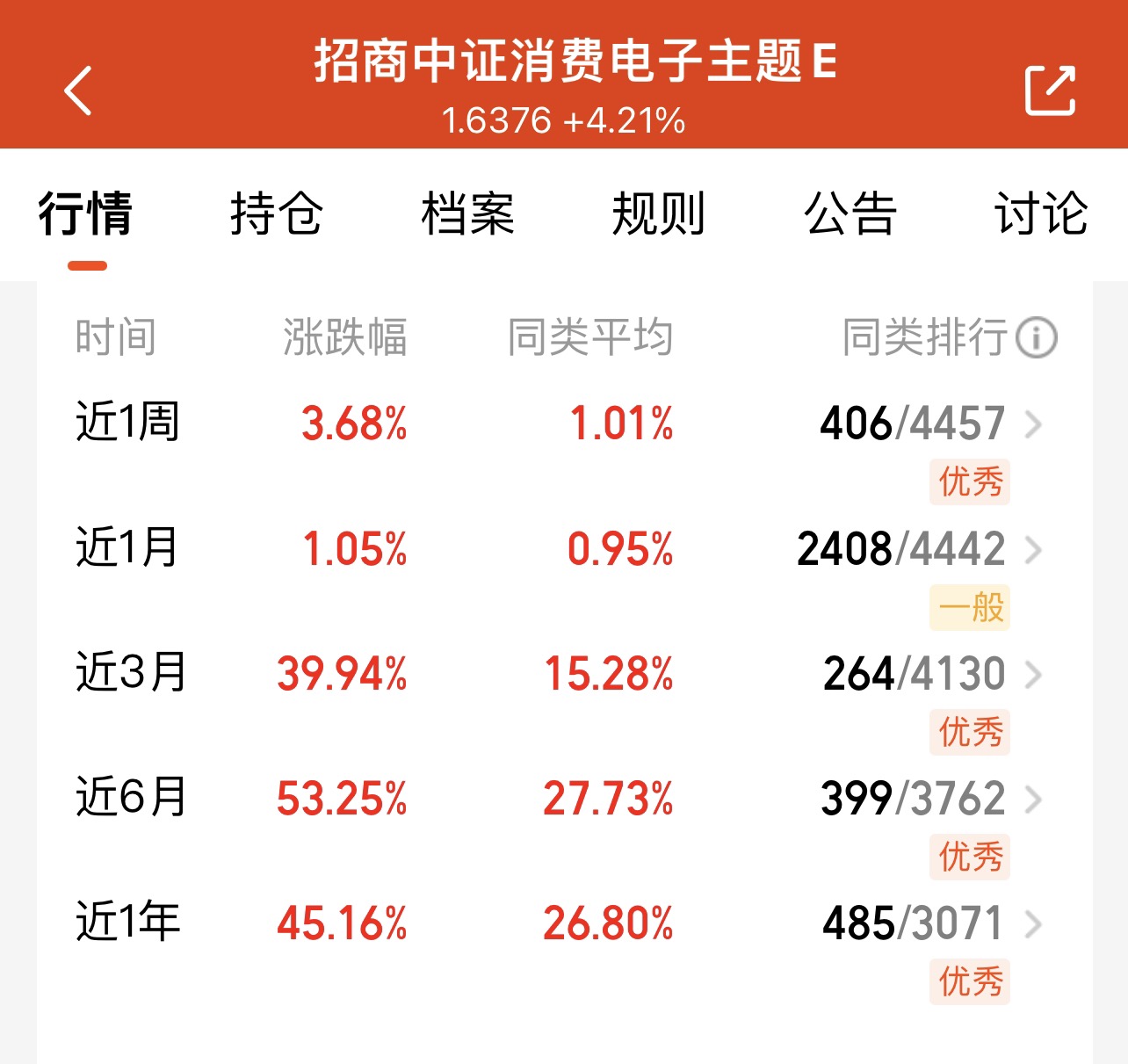 招商中证消费电子C这波又起飞了!近六个月涨幅高达53.25%,昨日更是劲涨4.21%。主要动力来自苹果新机iPhone 17系列销量超预期,带动产业链情绪全面升温,苹果股价周一盘中也一度大涨4%。此外,关税预期缓和的消息也给消费电子板块再添一把火。整体来看,板块景气度回升、资金持续回流,短期波段机会依旧充足。像招商消费电子C这种集中布局核心龙头的指数产品,弹性足、反应快,我继续关注、择机加仓。