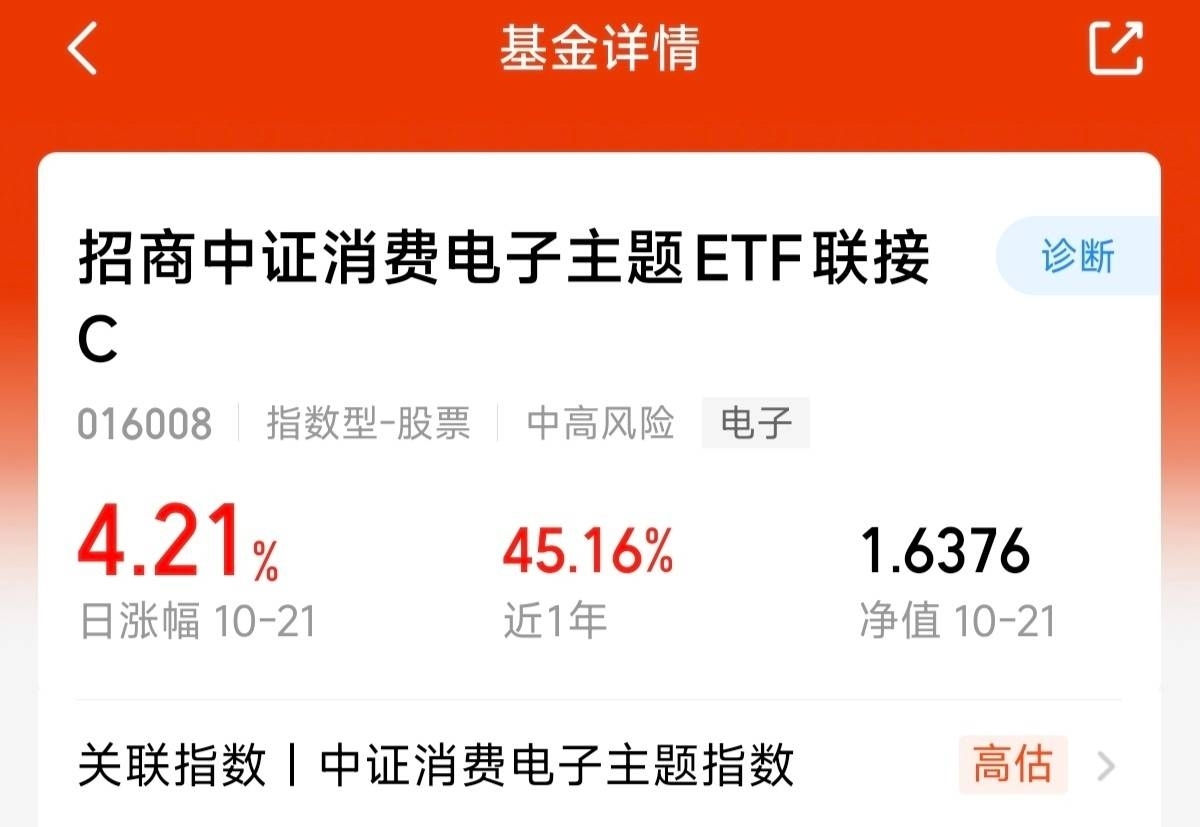$招商中证消费电子主题ETF联接C$ ,这只聚焦消费电子的指数基金。紧密跟踪中证消费电子指数。昨天上涨了4.21%。同类涨幅再次做到了领先。跟踪指数的精准度高。近一年涨幅达到了45.16%。大幅跑赢了同类平均业绩。还跑赢了指数的涨幅。我看好在四季度消费电子板块成长中的收益表现。准备开始布局了。