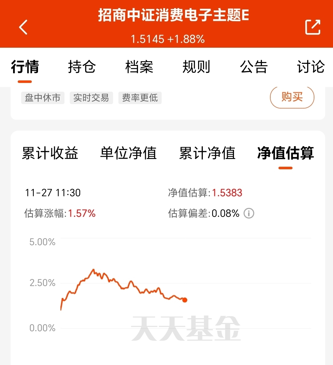 截至午间收盘$招商中证消费电子主题ETF联接C$ 预计上涨1.57%。