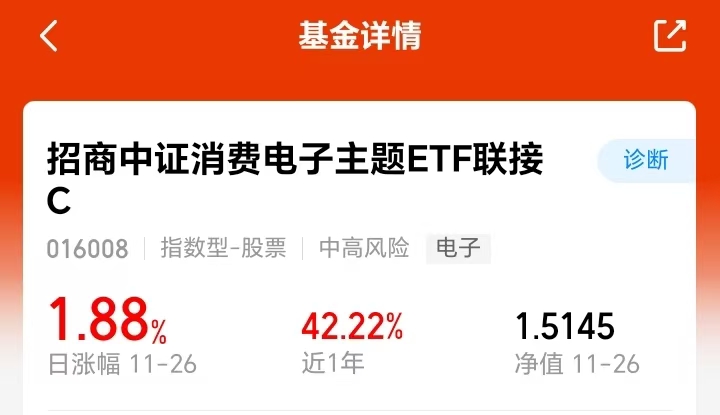 今天A股低开拉升,板块轮动有所加速,消费电子板块即将四连涨,表现强势。近期多款AI产品即将推出,持续催化板块行情。我关注的$招商中证消费电子主题ETF联接C(OTCFUND|016008)$昨天涨了1.88%,今日盘中估值上涨1.24%,近1年涨了42.22%,表现不错呢。