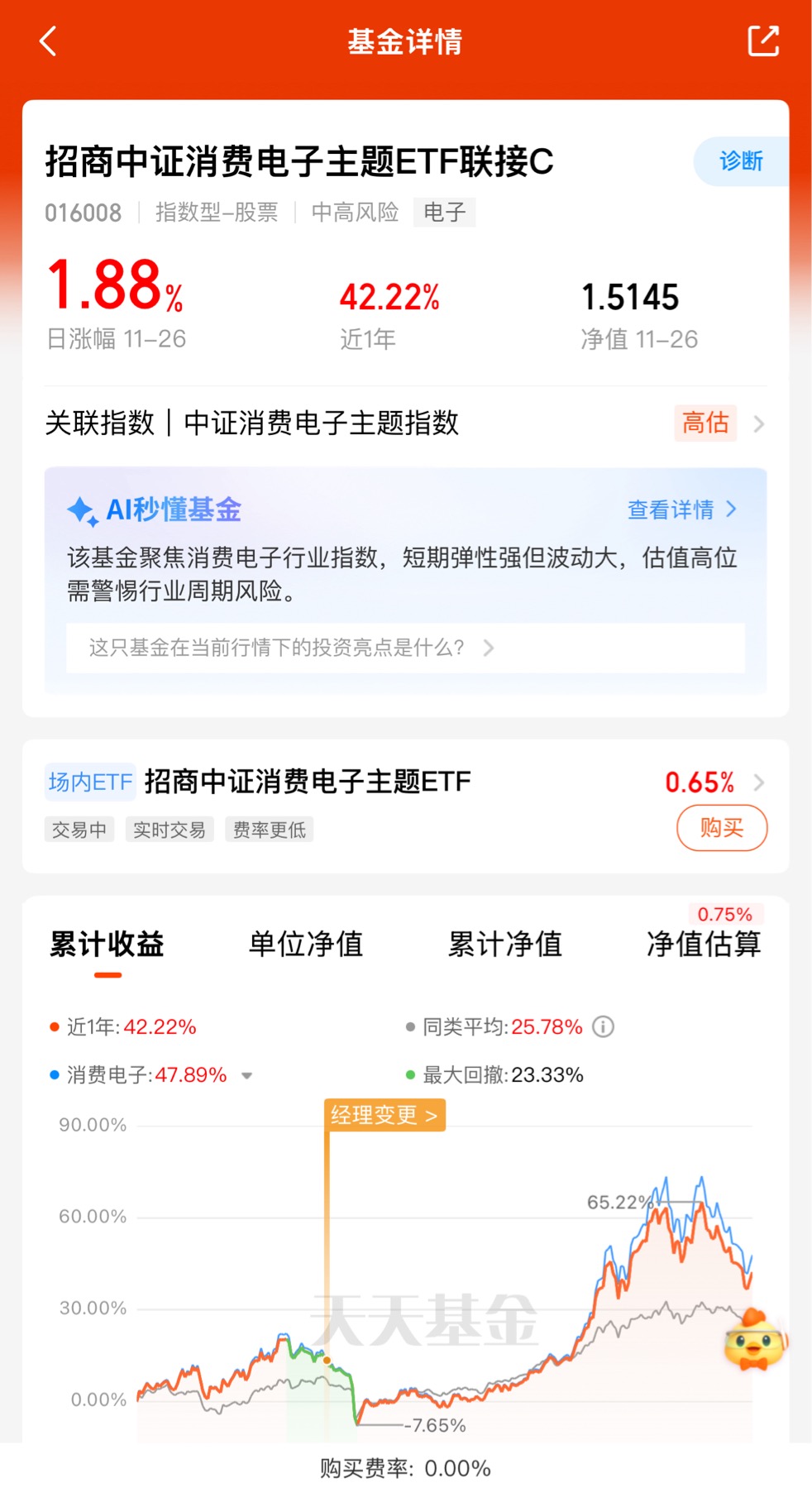 我继续持有招商中证消费电子主题ETF联接C,其精准布局产业链核心龙头的特点,能有效捕捉AI技术赋能消费电子的发展红利。在行业创新周期与估值修复的双重驱动下,对其中长期表现保持乐观期待。