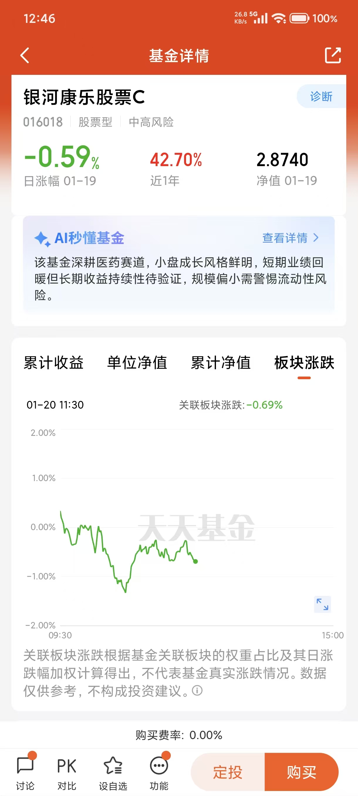 今天我选择加仓2000元银河康乐股票C(016018),这只基金深耕医药赛道,但是重仓方向并非传统创新药,而是AI医疗、医疗互联网、医疗软件等科技属性更强的赛道。前十大重仓股包括泓博医药、健民集团、东诚药业等。这只基金近一周涨幅18.86%,同类排名位居前列。现在调整就是加仓的机会,长期看好这只基金的表现。$银河康乐股票C(OTCFUND|016018)$