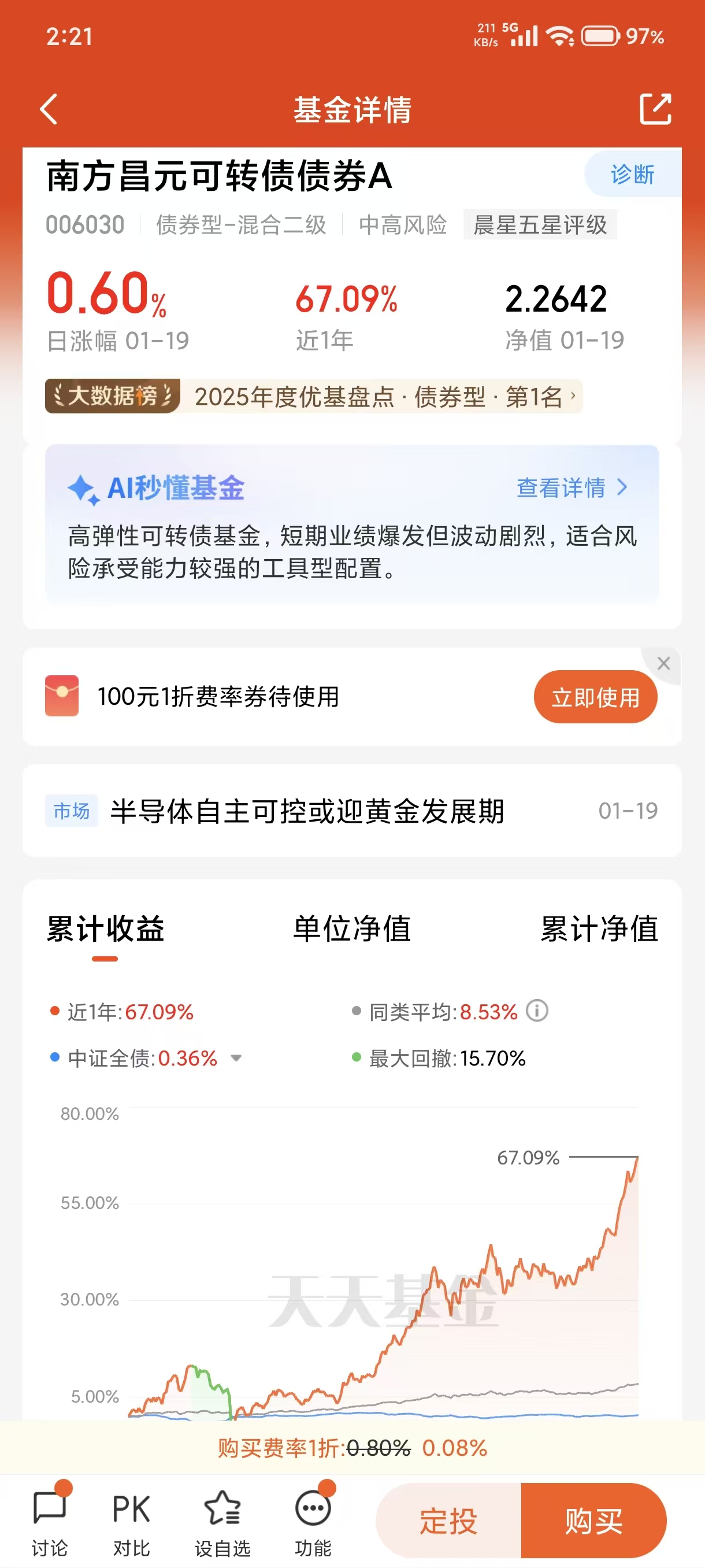 今天我选择加仓1000元南方昌元可转债A(006030),这只基金主要投资于可转换债券。也可配置少量股票(通常不超过20%)以增强收益,会配置一部分利率债、信用债等纯债资产来平衡风险。$南方昌元可转债债券A(OTCFUND|006030)$