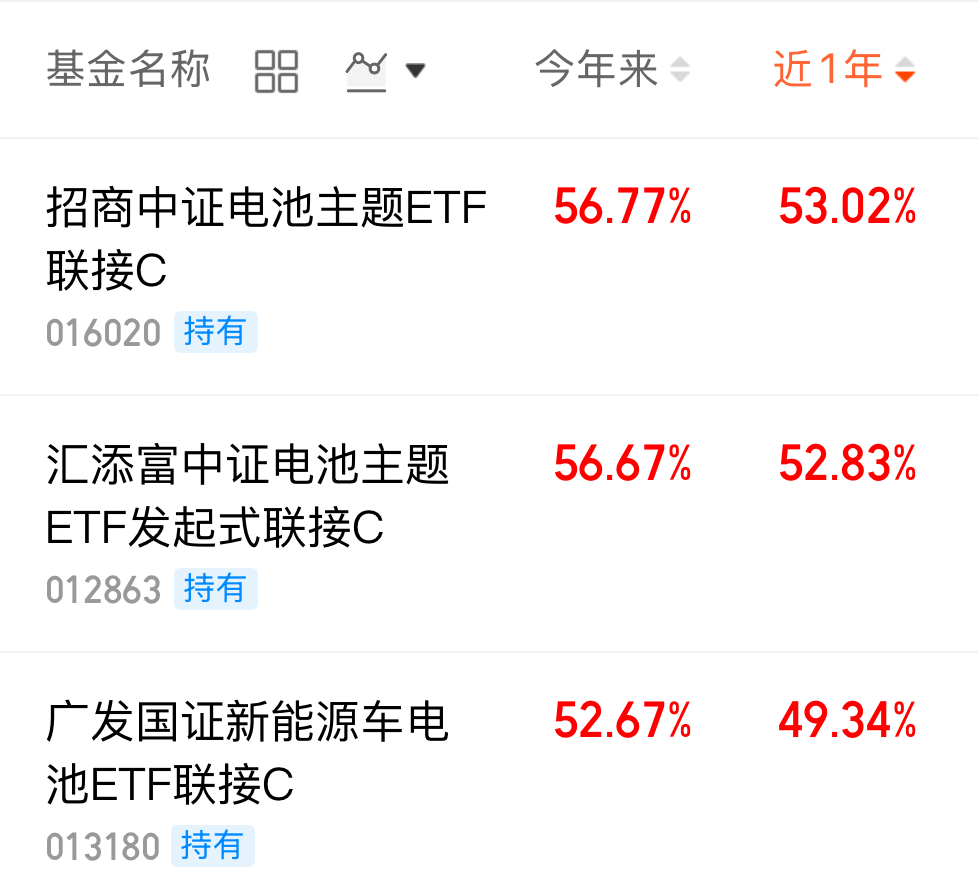 我投的招商中证电池主题ETF联接C紧密跟踪中证电池主题指数,前十大权重股囊括宁德时代、比亚迪、天齐锂业等行业龙头,既包含直接受益于碳酸锂涨价的锂资源企业,也覆盖具备技术壁垒的电池制造龙头,完美捕捉行业反转带来的全链条红利,今年以来涨了56.77%,近1年涨幅53.02%,跑赢同类电池指数。
