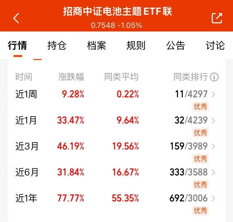 今天A股反弹啦,三大指数均涨幅不错,人工智能、芯片、半导体等上涨了,还有电池赛道也紧跟回暖了,固态电池技术加速从实验室走向量产,前景不错呀!$招商中证电池主题ETF联接C(OTCFUND|016020)$目前估值上涨2.12%,紧密跟踪CS电池指数的,固态电池概念占40%+储能概念占60%,高度集中于电池产业链,年化收益率77.7%,优于同类产品,我也打算择机布局起来啦!