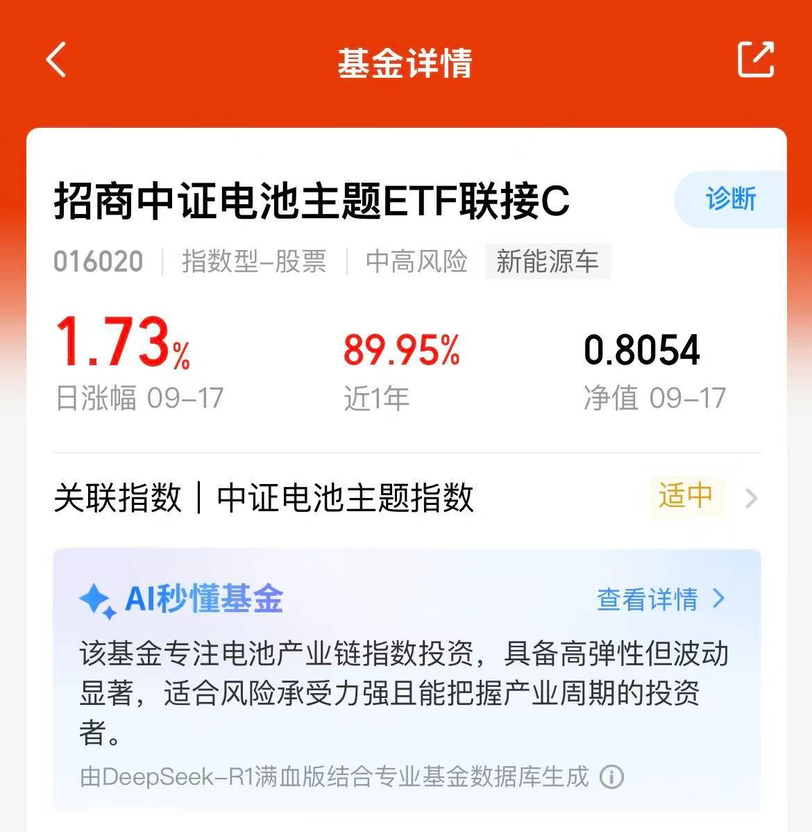 今天A股又继续反弹啦,三大指数均涨幅不错,电池板块也是上扬啦,$招商中证电池主题ETF联接C(OTCFUND|016020)$覆盖电池主题全产业链上市公司,估值上涨1.2%,近一个月涨幅33.12%,近一年涨幅89.95%,业绩优秀,表现出色,我觉得电池利好多多,技术与市场双重突破,我觉得从长远来看,未来可期,可以耐心的持有,收获定会不错的。