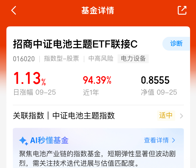 今天大盘迎来一波调整,大科技普跌,军工有色顺势走强,电池板块盘中波动加剧,不过,$招商中证电池主题ETF联接C(OTCFUND|016020)$昨天收涨1.13%,近一年涨幅高达94.39%,还是比较亮眼的,随着全球储能需求大大超预期,再加上背后电价机制改革的进一步催化,储能终局空间将逐步扩大,电池行情有望继续走高!$广发国证新能源车电池ETF联接C(OTCFUND|013180)$0$永赢科技智选混合发起C(OTCFUND|022365)$$东财消费电子增强C(OTCFUND|012320)$#特朗普挥关税大棒:药品或遭高关税##9月游戏版号发放 景气度或超预期#