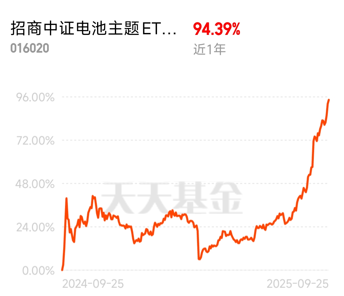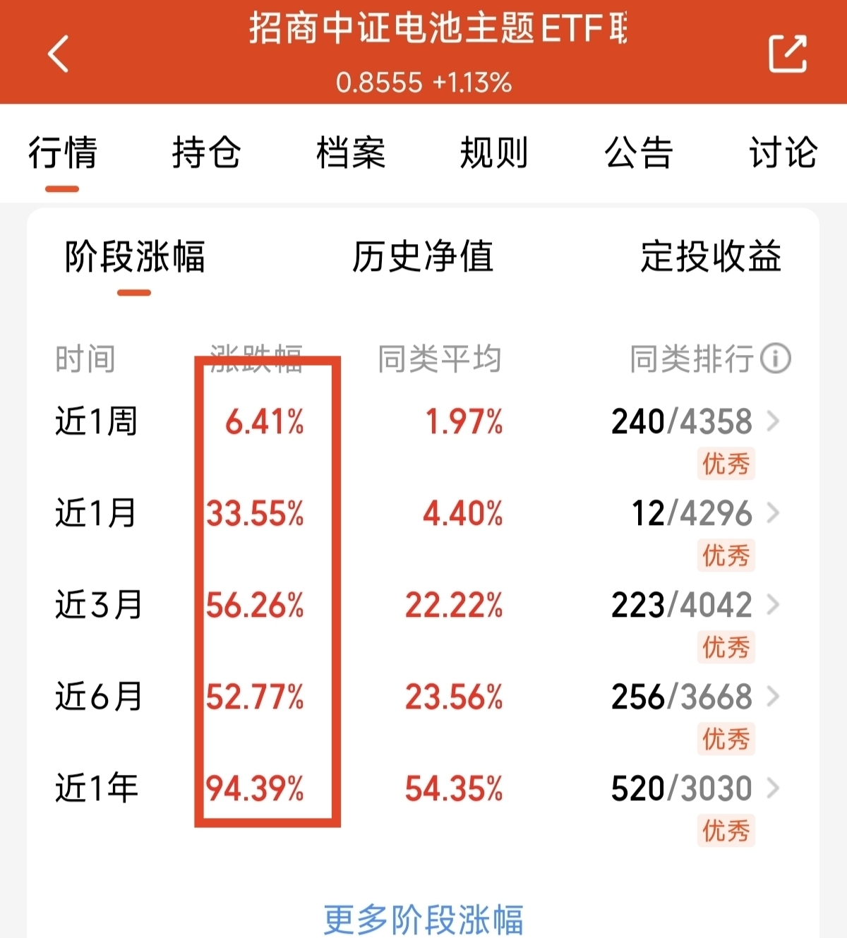 $招商中证电池主题ETF联接C$ 这只跟踪中证电池指数指数基金,全面覆盖了电池上下游产业链,对比其他电池类指数。固态电池跟储能电池的含比更高,所以说今年来的表现一直不错。昨天又上涨了1.13%。前天更是大涨3.46%。已经稳稳做到4天连涨。近3月涨幅33.55%。涨幅同类电池基金的五倍还多。近一年涨幅达到了94.39%,稳定大幅跑赢了同类平均业绩!今天估值早盘继续继续逆势领涨,还是比传统的电池要强很多。从长期来看,经过前期三年的调整,电池板块估值低。性价比高。未来的成长空间大。我也是看好未来的成长表现。准备开始布局了。